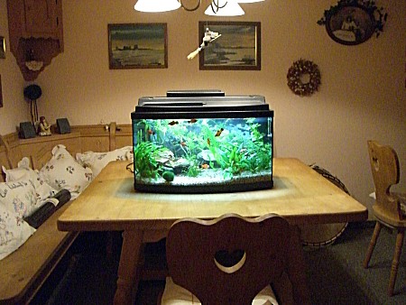 im großen, 355 Liter-Becken. Auf dem Foto könnt Ihr unser Aquarium nun an seinem neuen Standort sehen.