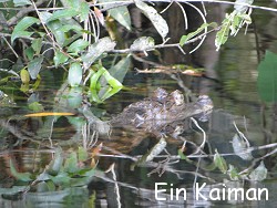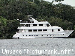 Halli Hallo Ihr Lieben. Ich schrieb doch gestern, dass wir zum Schlafen auf ein Boot umziehen müssen. Sagte ich Boot? Das was uns da gestern Nachmittag erwartete ist eine 30 Meter-Yacht und gehört dem Besitzer der Eco-Lodge! Die "Captain Logan" liegt ca. 1,5 Kilometer den Fluss runter in einer kleinen Bucht vor Anker. Als wir dort gestern ankamen wurden wir erst mal von Terry, dem anderen Guide herum geführt. Überall Fluff-Teppich am Boden, Satelitenfernsehen, DVD- und CD-Player, Hausbar, Bordküche und und und. Wir waren dermaßen beeindruckt, dass wir vorschlugen, alle kommenden Nächte, die wir eigentlich in der Lodge verbringen würden, ja gleich hier bleiben könnten. Terry klärte das kurz ab und schon war unsere schwimmende Unterkunft für die restlichen Tage fix gemacht. Kaum hatten wir den Wahnsinnseindruck verarbeitet, kam schon wieder ein Schnellboot und holte uns zum Angeln ab. Wir tuckerten wieder ins Dickicht - diesmal an eine andere Stelle und warfen unsere Bambus-Angeln aus. Auf einmal deutete Alex auf einen Busch und dann konnten wir ihn auch sehen,.... einen ungefähr 7 Jahre alten und 2 Meter langen Kaiman. Er beobachtete uns genauso wie wir ihn beobachteten. Alex spießte ein großes Fleischstück auf seine Angel und lockte den Kaiman so aus aus seinem Versteck. Langsam kam er auf unser Boot zu und ... happs, hatte er sich das Schnitzel von der Angel geklaut. Wie eine Trophäe trug er es im Maul zurück ins Dickicht wo er es dann genüsslich verspeiste. Dafür hielt sich unser Anglerglück wieder in Grenzen. Bis auf einen Katzenwels, den Alex herauszog fingen wir leider wieder keinen Piranha. Der Katzenwels fauchte richtig, als ihn Alex vom Haken befreite. Er nahm ihn in die Hand und zeigte uns die spitzen Stacheln die von seinen Flossen wegstanden bevor er ihn wieder zurück ins Wasser setzte wo der Wels sogleich verschwand.