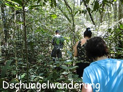 Am Nachmittag gingen wir mit Rosalina und einem kundigen Führer nochmal in den Dschungel. Die Wanderung führte uns diesesmal noch tiefer hinein ins grüne Dickicht und immer wieder mussten wir über mannsdicke Wurzeln steigen und unter armdicken Lianen durchklettern. Rosalina erzählte immer wieder wichtige Informationen wie man zum Beispiel mit einem Harz Feuer macht und Mücken vertreibt. Sie erzählte wieder viel über sämtliche Heilpflanzen und verschiedene Tierarten. Irre interessant. Und so vergingen die fast 3 Stunden im Dschungel wie im Flug. Jetzt waren wir so richtig platt! Drum passiert heute auch nicht mehr viel. Wir essen noch eine Kleinigkeit und hauen uns dann aufs Ohr in unserem Bungalow. Morgen werden wir noch ein Runde paddeln gehen und Mittags bringt uns Rosalina dann wieder zurück ins Hotel.