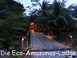 Heute wars dann endlich soweit. Unser Aufenthalt im Dschungel beginnt! Doch erst mussten wir erfahren, als uns der Fahrer abholte, dass wir nicht in die von uns gebuchte Lodge reisen können. Ein Sturm hat dort etliche Dächer abgedeckt und auch sonst viel dem Erdboden gleich gemacht. Sogar ein Baum soll in das Restaurant gekracht sein. Hm, na gut. Kann man nicht ändern, fahren wir halt woanders hin. Obgleich wir zwei schon vielsagende Blicke tauschten. Na ob das mal was wird. Aber wir lassen uns ja gern überraschen. Wir wurden also zu einem kleinen Dock gebracht und von dort gings dann wieder per Amazonas-Boot weiter. Nach ungefähr eine halben Stunde erreichten wir dann die Eco Amazonas Lodge. Die Lodge ist tief drinnen im Dschungel und an einem kleinen Seitenarm des Hauptflusses gelegen. Der genaue Name ist mir schon wieder entfallen, aber es ist sehr idyllisch hier. Der Flußarm selbst ist so breit, dass er schon fast wie ein kleiner See mit spiegelglatter Wasseroberfläche aussieht. Überall schwirren kleine bunte Vögel herum und der Dschungel beginnt quasi hinter der mit Palmenblättern gedeckten Eingangshalle. Rosalina, unsere Betreuung für die nächsten Tage kam und begrüßte uns sehr herzlich. Sie entschuldigte sich gleich für die entstandenen Umstände. Wir bekamen von ihr einen leckeren Fruchtcocktail aus Cupuacu und einem Sirup. Dazu gabs Bananenchips. Kurz darauf bezogen wir einen Bungalow tief drin im Dschungel. Um dort hin zu gelangen ist man schon mal ca. 5 Minuten zu Fuß unterwegs. Aber die Wege sind alle gut ausgebaut. Ab und zu muss man halt über eine Termiten- oder Ameisenstraße hinwegsteigen. Aber das gehört hier ja dazu.
