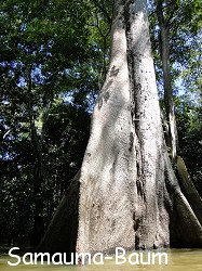Mensch, war das ein toller Tag heute! Bin immer noch voll geplättet von der Schönheit, dieser faszinierenden Gegend. In der Früh um viertel vor neun schipperten wir mit einem Amazonas-Dampfer auf dem Rio Negro zum Meeting of the Waters. Unser Guide erklärte uns in ganz schlechtem Englisch, dass sich die beiden Flüsse erst nach einigen Kilometern vollständig miteinander vermischen. Der Rio Negro mit seinem Schwarzwasser hat ca. 28 Grad. Der Rio Solimois jedoch nur ca. 22 Grad. Dieser Temperaturunterschied bewirkt, dass man die Linie, wo die beiden Flüsse zusammentreffen gestochen scharf sehen kann. Echt beeindruckend. Ab hier ist das dann auch offiziell der Amazonas. Wir tuckerten dann eine ganze Weile auf dieser Linie den Fluss hinauf und bogen dann in einen kleineren Seitenarm ab. Zu unserer Linken konnten wir immer wieder mal die legendären Flussdelfine springen sehen. Zur Mittagszeit erreichte unser Dampfer dann ein schwimmendes Restaurant. Doch bevor wir uns die regionalen Spezialitäten schmecken ließen, stiegen wir alle in kleine motorisierte Kanus um. Ja und dann begann das absolute Highlight dieses Tages. Mit diesen Gefährten tauchten wir ein in den völlig überschwemmten Urwald. Man kann sich das kaum vorstellen, wenn man es nicht mit eigenen Augen gesehen hat. Der ganze Wald ist auf Grund des Hochwassers ca. 7-8 Meter überflutet. Die Bäume stehen quasi bis zur Hälfte im Wasser. Absolut genial dieser Anblick. Wir tuckerten mit den Kanus auf den etwas breiteren "Wasserstraßen" durch den Wald. Üppige Vegetation soweit das Auge blicken konnte. Und immer wieder das Spiel zwischen Licht und Schatten. Einfach herrlich! Ich konnte sogar beim Blick nach oben 3 blaue Aras ausmachen, wie sie über die Wipfel flogen und dabei das charakteristische Krächzen von sich gaben. Lianen hängen von den Ästen herunter und immer wieder hörten wir das laute Schreien der Brüllaffen in den Bäumen. Gigantisch! Irgendwann hielten wir vor einem mächtigen Baum. Die Einheimischen nennen diesen Samauma, denn sie benutzen diesen um auf seinen Wurzeln zu trommeln. Unser Guide erklärte uns, dass man das Trommeln kilometerweit durch den Dschungel hören kann. Jetzt während der Hochwasserzeit saugen sich die Wurzeln komplett mit Wasser voll. In der Trockenzeit zehrt dann der ganze Baum davon. Auf diesem Bild könnt ihr diesen Riesen sehen.