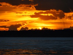 Hallihallo Ihr Lieben. Heute unternahmen wir außer nixtun rein gar nix. Es war auch kaum auszuhalten draußen. Unerträglich schwül und fast keine Luft zum Atmen. Gleich nach dem Frühstück um halb neun gingen wir runter zum Fluss und blickten auf den langsam dahinfließenden Strom. Wir hatten Glück, denn eine kleine Delfinschule kam des Wegs und wir konnten sie wieder auf- und abtauchen sehen. Schon witzig. Delfine im Süßwasser anzutreffen. Danach machten wir es uns auf der Poolterrasse gemütlich. Natürlich im Schatten, denn die Sonne stach buchstäblich vom fast wolkenlosen Himmel. Trotz Lichtschutzfaktor 50 hats uns an den Armen und Schultern erwischt. Möchte nicht wissen, wie es einen verbrennt, der sich nicht einschmiert. Und immer wieder das gleiche Bild. Käsig weiße Europäer liegen wie Brote in der prallen Sonne. Mich würd ja der Hitzschlag ereilen. Bevors bei uns soweit war, verzogen wir uns ins klimatisierte Zimmer. Erst zum Sonnenuntergang der hier schon um kurz vor 18 Uhr ist, trauten wir uns wieder raus. Wir bummelten bei immer noch 27 Grad runter zum Rio Negro und sahen der Sonne zu wie sie im - ja hier muss man sagen, im Fluss versank. Keine 5 Minuten hats gedauert und wupp weg war sie. Wolfi testete die neue Kamera mit allen möglichen Einstellungen und so konnten wir herrliche Bilder vom Sonnenuntergang und der "blauen Stunde" machen. Morgen geht's wieder auf einen Ausflug. Wir machen eine Stadtrundfahrt in Manaus. Bestimmt auch interessant. Also dann. Bis demnächst.