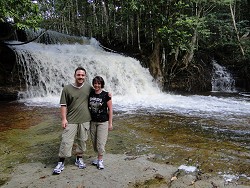 Wir durften heute wieder einen wunderschönen Tag mitten in der schier endlosen Natur erleben. In der Früh um halb neun fuhren wir mit dem Bus ca. 100 km zu den großen Wasserfällen. Mit uns im Bus waren noch ein australisches Ehepaar, eine brasilianische Frau und James, unser Guide. Der Highway hinter Manaus verläuft kerzengerade durch den Urwald. Links und rechts der Straße fängt schon der Dschungel an. Teilweise so dicht, dass man gar keinen Pfad oder Durchgang erkennen konnte. Dafür beim Blick in die Baumkronen immer mal wieder fliegende Tukane oder Aras. Nach 1,5 Stunden Fahrt erreichten wir den ersten von insgesamt drei Wasserfällen. James erklärte uns, dass das Wasser aus kleinen Quellen im Wald stammt, sich dann zu kleinen Bächen sammelt, die irgendwann alle in den Amazonas fließen. Das Quellwasser ist sehr sauber und man kann sogar drin schwimmen. Der Australier musste das natürlich ausprobieren und stürzte sich in die Strömung. James erklärte uns derweil, dass hier die Orchideen teilweise auf den Bäumen wachsen, da die Samen mit dem Vogelkot auf den Baum gekommen sind. Durch die ständige Feuchtigkeit im Wald keimten sie aus und blühen dort oben. Von den Ästen streckt die Pflanze eine lange Wurzel zu Boden. Ist diese unten angekommen, kann die Orchidee auch wichtige Salze und Mineralien aus dem Boden ziehen. Wasser kommt von oben ja genug. Nach vielen Fotos ging die Busfahrt weiter zu wilden Stromschnellen. Mutige Einheimische stürzten sich dort hinein. Unserem Australier war das aber dann doch ein bisschen zu wild. Das anschließende Mittagessen gabs in einem kleinen gemütlichen Restaurant. Wir aßen Pirarucu. Pirarucu ist der größte Fisch im Amazonas und kann fast 3 Meter lang werden. Viele Mythen und Legenden ranken sich um diesen geheimnissvollen Amazonasbewohner. Manche Leute hier sagen sogar, dass der Pirarucu Menschen frisst. Uns hat er jedenfalls gut geschmeckt. Dazu gabs Reis, Pommes und dieses Manjok-Mehl. Nach dem Essen stiegen wir wieder in den Bus und fuhren zu einem weiteren Wasserfall. Jetzt gabs für den unerschrockenen Australier kein halten mehr. Er stellte sich mitten rein und hatte schon ein wenig Mühe das Gleichgewicht auf den glitschigen Steinen zu halten. Auf alle Fälle ein lustiger Anblick. Wir ließen derweil ganz gemütlich die Füße im Wasser baumeln und genossen die Natur. Pünktlich um 17 Uhr erreichten wir wieder das Hotel. Nachdem wir uns noch einen leckeren Cappuchino mit Zimt schmecken ließen gingen wir aufs Zimmer und fingen an, unsere Koffer zu packen. Später gabs dann noch eine erfrischende Dusche, ein Bierchen sowie eine letzte Caipirinha an der Poolbar. Wir sind früh ins Bett, denn morgen geht's zeitig los mit einem hammermässigen langen Tag.