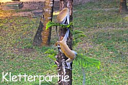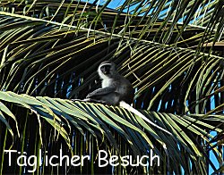 Palmwedeln. Schon witzig hier alles. Vor allem Affen bzw. Meerkatzen kennen wir ja nur aus dem Tierpark. Und hier laufen sie