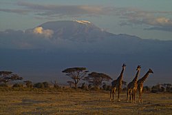 bewachsenen Ebene, wo die Tiere wie hingetupft friedlich miteinander leben, da gehören sie einfach hin. Bald lichteten sich auch die Wolken rund um den Gipfel des Kilimandscharos, so