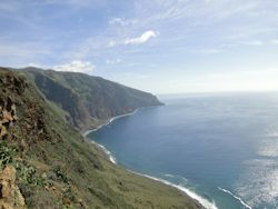 Heute waren wir mit dem Auto auf der Insel unterwegs und haben eine tolle Rundfahrt unternommen. Wir fuhren Richtung Norden mitten durch Madeiras Zentralgebirge mit bis zu 1800 Meter hohen Bergen. Der steile Encumeada-Pass schlängelte sich in engen Serpentinen immer weiter nach oben den tiefhängenden Wolken entgegen. Zwischendurch stoppten wir immer mal wieder und genossen die herrliche Aussicht auf die umliegenden Gipfel. Es gab herrliche Lichtspiele wenn die Sonne durch die Wolken brach und die Berghänge anstrahlte. Dort oben wars ganz schön windig und frisch. Auf der anderen Seite des Passes fuhren wir mitten durch eine Nebelwand. Als wir aus dem Dunst wieder herauskamen schien die Sonne. Beim nächsten Aussichtspunkt hielten wir wieder an und konnten bereits die Orte auf der Nordküste in der Ferne erkennen. Die Straße war gesäumt von vielen blauen Schmucklilien. Leider sind die meisten schon verblüht, was man an den braunen Blütenköpfen erkennen kann. Aber es waren immer noch genug da um unser Auge zu erfreuen. Wir fuhren weiter in Richtung Sao Vicente. Dort besuchten wir die Grutas de Sao Vicente. Diese auf Madeira einmaligen Höhlen sind Vulkanröhren und entstanden, nachdem die Lava an der Oberfläche bereits erkaltet war und im Inneren das glühend heiße Magma abgeflossen ist. Die Höhlen werden auf ca. 400.000 bis 800.000 Jahre geschätzt und wurden von den Einheimischen durch Zufall entdeckt. Die Grotten sind mit tollen Lichteffekten ausgeleuchtet und immer wo ein Lichtkegel einen kleinen Bereich erhellt, wachsen kleine Farne und Moose. Winzige Samen sickern mit dem Wasser durchs Gestein und keimen dann aus. Heute fließen durch einige Röhren kleine Bäche. Teilweise haben sich sogar Seen gebildet. Im Visitor-Center haben wir noch eine spannende 4D-Filmvorführung gesehen. Man startete als Magmateilchen im Erdkern und wanderte durch die verschiedenen Erdschichten bis man durch einen Vulkanschlot an die Oberfläche befördert wurde. Wind und kleine Wassetröpfchen machten die Illusion perfekt. Außerdem konnte man hier wissenswertes über den Atlantikvulkanismus und speziell über die Entstehung Madeiras erfahren. War sehr interessant. Ich mag ja sowas. Nachdem wir wieder ans Tageslicht gelangten genehmigten wir uns am Kiosk ein Erfrischungsgetränk und tigerten dann weiter Richtung Westküste. Leider war die alte Küstenstraße gesperrt und so mussten wir durch viele Tunnel fahren. In Porto Moniz fuhren wir wieder steil bergauf und gelangten durch heimelige Dörfer und urige Wälder bald nach Ponta do Pargo. Dort angekommen fuhren wir zum Leuchtturm und zu den 600 Meter hohen Klippen. Kaum eine Menschenseele hat sich bis hierher verirrt. Nur wir zwei und noch ein Pärchen ließ sich den Wind um die Nase wehen. Der Leuchtturm blickte einsam mit seinem Spiegelauge hinaus aufs Meer. Wie vielen Schiffen mag er wohl schon den sicheren Weg vorbei an gefährlichen Untiefen gezeigt haben? Wir kraxelten einen kleinen Hang hinunter und standen dann direkt vorm Abgrund. Weit unter uns brandete das Meer schäumend an die senkrecht aufragenden Felsen. Ein gigantischer Anblick. Hier oben haben wir Kakteen gefunden und Gewächse die halbkugelförmig direkt an der Felskante wachsen. Als wir uns endlich vom großartigen Anblick der Steilküste lösen konnten waren wir dann auch in einer knappen Viertelstunde wieder daheim im Hotel. Wir bummelten dann noch an der Strandpromenade entlang und pflanzten uns in ein Café. Morgen wollen wir die Blumen-Levada wandern. Adlerfarn und Hortensien sollen dort in Hülle und Fülle wachsen. Man darf also gespannt sein was morgen wieder alles geboten ist. Ich wünsch Euch was.