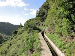 Nach einem leckeren Frühstück gings wieder zeitig los zur nächsten Wanderung. Wir fuhren wieder den Encumeada-Pass hinauf und ließen dort an einer Ausbuchtung der Straße unser Auto stehen. Schon nach wenigen Schritten erreichten wir den Einstieg zur Blumen-Levada und ein gelbes Schild wies den Weg ins Folhadal. Der Weg auf dem breiten Levada-Mäuerchen ließ sich bequem gehen und überall wuchsen die hübschen blauen Schmucklilien. Wir entdeckten auch Esskastanien. Bei uns besser bekannt unter dem Namen Maroni. Eine schmackhafte Leckerei in den Wintermonaten und auf den Christkindlmärkten überall erhältlich. Der Weg schlängelte sich gemütlich am Hang entlang und immer mal wieder konnte man hinüber auf den Pico Grande sehen. Bald erreichten wir den spannendsten Teil dieser Wanderung. Einen 600 Meter langen Tunnel durch den Berg hindurch auf die andere Seite. Wir holten unsere Taschenlampen heraus und stiegen dann in das dunkel gähnende Loch im Fels. Der Weg war teilweise sehr schmal und man musste ab und zu auf seinen Kopf aufpassen. Von der Decke tröpfelte es uns mal mehr, mal weniger stark in den Kragen. Drüben angekommen war es so, als wäre man durch diesen Tunnel in eine andere Welt gelangt. Auf der Nordseite war es windstill, schattig und wie in einer urzeitlichen Fantasiewelt. Überall wuchsen Farne und Moose und von den Ästen der alten Bäume hingen lianenartige Gewächse herunter. Am Rand des Levadaweges standen ab und zu 2 Meter hohe Hortensienbüsche. Manche blühten noch in intensivem Blau. Es wäre nicht verwunderlich gewesen, wenn Urzeitviecher uns den Weg versperrt oder Fantasiewesen in den Bäumen herumgeturnt hätten. Das ist das Folhadal. Die extreme vorherrschende Feuchtigkeit lässt die Vegetation hier so üppig wachsen. Wüsste man es nicht besser, der Pfad hätte auch ein Kokain-Schmuggler-Pfad irgendwo im kolumbianischen Dschungel sein können. Wir wanderten bis zu einem kleinen Wasserfall und machten dort ein Päuschen. Auf dem gleichen Weg ging es dann wieder zurück. Nun trafen wir auch auf ein paar andere Wanderer. Wieder am "Zeitreisetunnel" angekommen spähten wir hinein und suchten Lichtkegel von entgegenkommenden Wanderern. Zum Glück war alles frei, denn mit Gegenverkehr in diesem engen Tunnel wäre es sehr knifflig gewesen. Also nix wie rein und so schnell wie möglich im Halbdunkel und im Schein unserer Taschenlampen wieder hinüber auf die Südseite des Berges. Wieder in der "Gegenwart" angekommen trafen wir erneut auf ein kleines Grüppchen Wanderer. Diese waren etwas unschlüssig wegen des Tunnels, verschwanden aber bald in der Felsröhre. Wir indes, stiefelten auf dem Levada-Mäuerchen wieder zurück zum Anfang der Tour. Unterwegs boten sich noch ein paar blaue Schmucklilien als tolles Fotomotiv an. Da es grad mal Mittag war, beschlossen wir noch ein wenig mit dem Auto über die Insel zu fahren. Wir fuhren diesmal Richtung Osten. Es ging wieder bergauf und bergab. Auf der Nordostseite hingen die Wolken sehr tief und es nieselte auch gelegentlich. An einem Rastplatz entdeckten wir einen Madonnen-Altar. Die Einheimischen gedenken hier wohl irgendjemandem oder irgendwas denn es standen viele Grablichter und erloschene Teelichter herum. Um die Madonnen-Statue baumelten zwei Rosenkränze. Unten am Sockel des Altars stand ein Grablicht dessen Flamme erloschen war. Nach einer kleinen Fummelei, da der Docht abgebrochen war, zündeten wir dieses Licht wieder an und stellten es wieder an seinen Platz zurück. Weit im Osten liegt die Stadt Santana. Dort gibt es lustige kleine mit Stroh gedeckte Häuschen. Die Santana-Häuschen. An der Nordost-Küste war diese Bauweise früher vorherrschend denn dort ist das Klima rau und feucht. Das Stroh schützt vor allen Unbillen des Wetters und hält schön warm und trocken. Die Häuschen stehen überall in der Stadt verstreut. Leider oftmals so ungünstig, dass man sie erst im Vorbeifahren kurz sieht. Wir besuchten an der Küste noch einen Aussichtspunkt an dem man auf den Adlerfelsen schauen kann. Der Adlerfelsen heißt so, da hier früher die Seeadler brüteten. Hier pfiff einem der Wind wieder steif um die Ohren und drum düsten wir nach ein paar Fotos auch wieder weiter. Über die Schnellstraße fuhren wir über Funchal wieder zurück ins Hotel. Wir stellten fest, dass auf der Südseite in der Tat die Sonnenseite der Insel ist. Kaum hatten wir die Berge hinter uns gelassen, rissen die Wolken auseinander und die Sonne schien auf uns herunter. Sofort wurde es spürbar wärmer. Diese herrliche Nachmittagssonne genossen wir noch ein wenig in der Strandbar gegenüber. Gestern hatten wir übrigens noch wahnsinniges Glück mit dem Sonnenuntergang. Die Sonne versank ganz kitschig in den schönsten Orange- und Rosatönen im Meer. Oft ist es so, dass die Sonne hinter einem Dunstschleier am Horizont einfach verschwindet, aber gestern wars wie in einer Schmonzette. So weit so gut für heute. Ich hau mich hin. Morgen geht's wieder zeitig raus, man will schließlich was haben vom Tag und nicht so wie manch andere hier… um 9 Uhr erst mal frühstücken gehen…tztztzt.